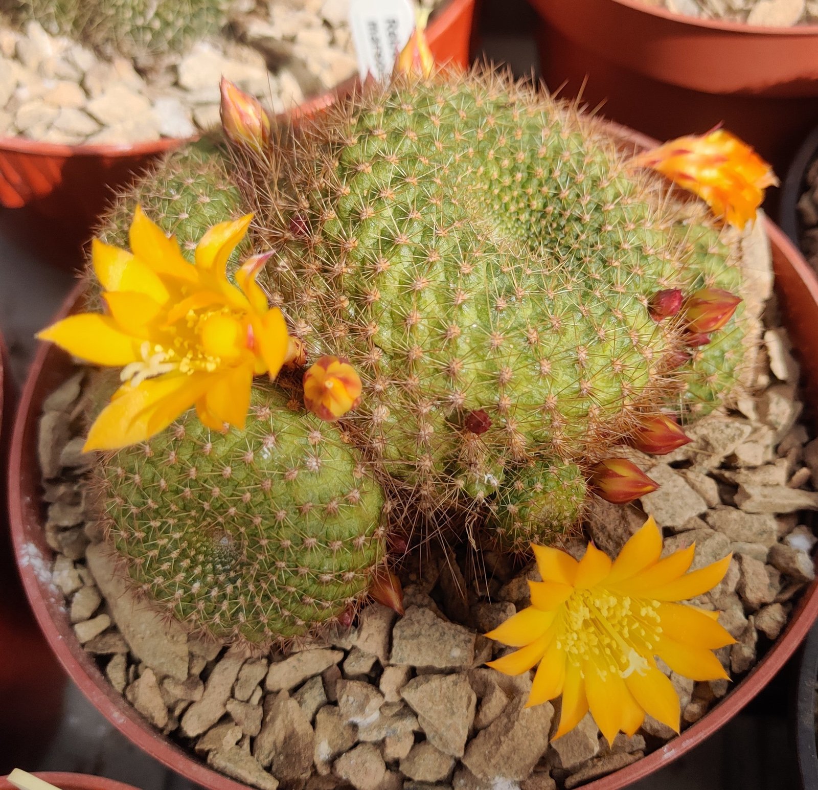 Rebutia marsoneri is a small but an extremely very free flowering cactus with bright yellow to bright orange blooms. The spines are thin and bristly, a great addition to any collection.