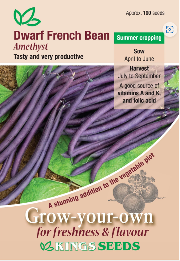A heavy cropper producing attractive and very tasty 15cm (6in) purple pods of superb quality. (Buff light brown seeds).