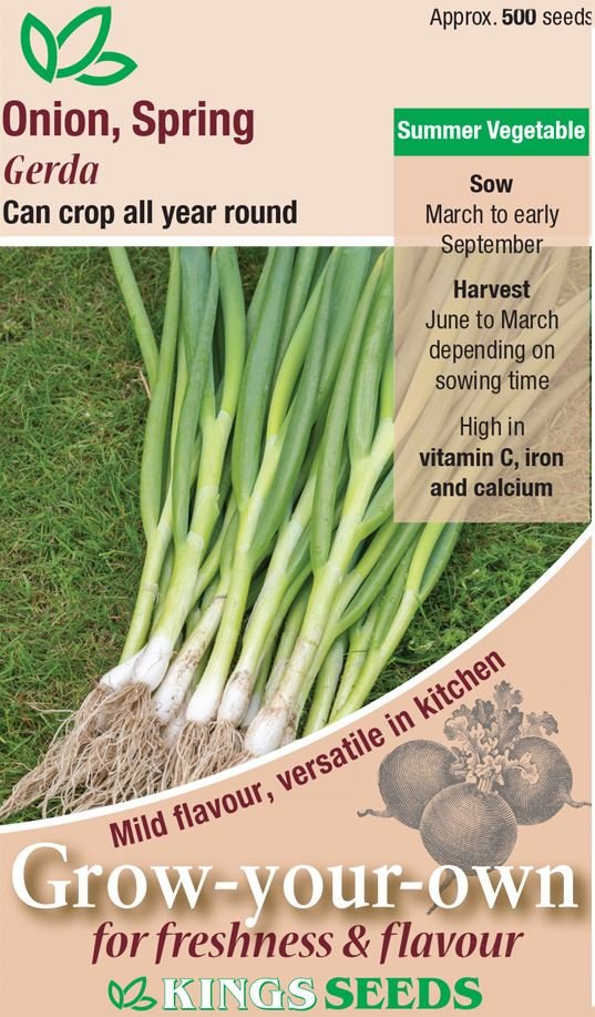 Kings Seeds – Vegetable – Onion Spring Gerda :- All Year round spring onions. Dark erect leaves with bright white shanks. A mild onion flavour which is highly versatile in the kitchen, either raw or cooked in salads and stir fries.