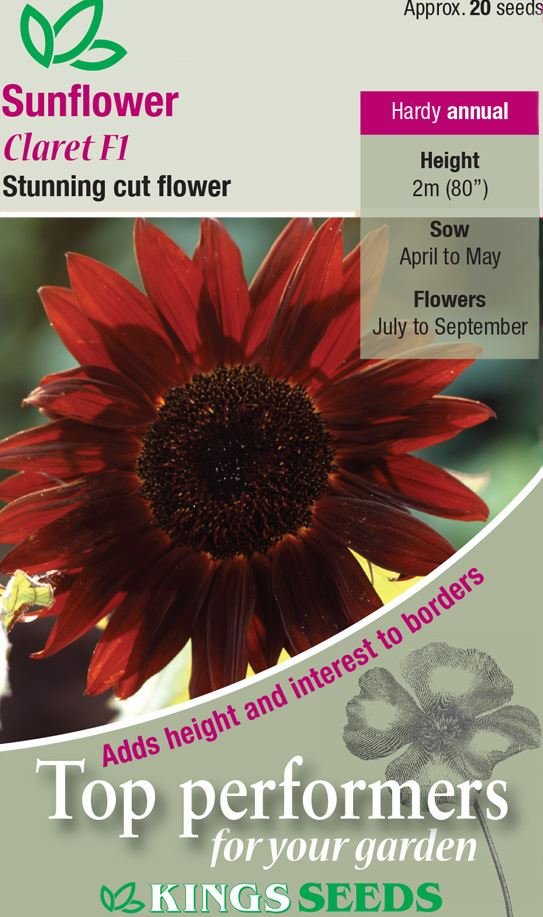 Kings Seeds – Flower – Sunflower Claret F1 :- Stunning deep red sunflower blooms resembling the late evening sun. As they mature they develop a gorgeous metallic sheen. Position in full sun, preferably in a position sheltered from winds. Hardy Annual Height: 2m (80cm)