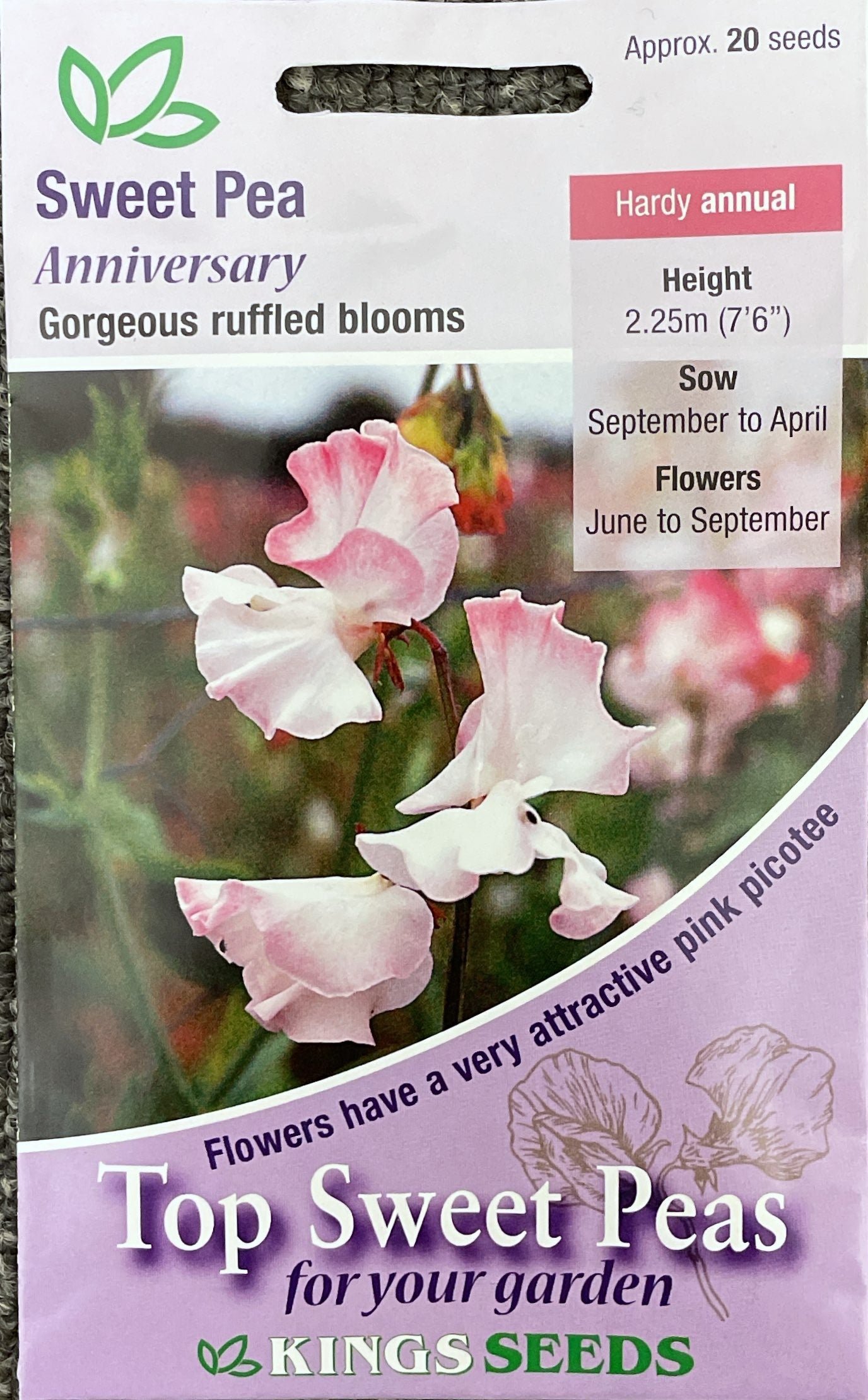 Anniversary is a gorgeous pink picotee which opens creamy with pink edges. It is a highly scented Spencer variety that is well ruffled with waved wings.