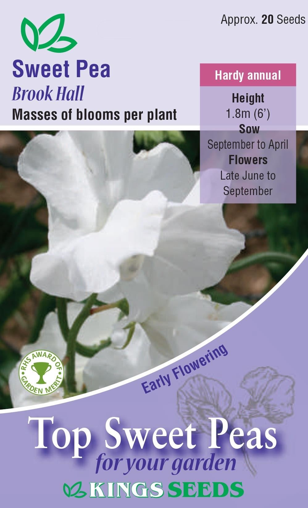Kings Seeds – Flower – Sweet Pea Brook Hall :- This long stemmed sweet pea produces many pure white flowers with waved wings and long stems which make for a good cut flower. Brook Hall is a well scented Spencer type that has the RHS Award of Garden Merit. Hardy Annual Height: 6-8ft tall (180cm – 220cm)