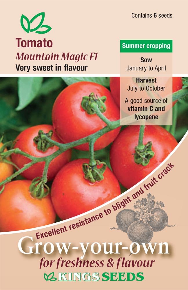 Tomato Magic Mountain has a very rich flavour. This tomato brings together the best of both heritage types and the benefits of the disease resistance that comes with a F1 Hybrid. This variety has great resistance to blight as well as verticillium and fusarium wilt. It is an indeterminate, cordon type tomato.