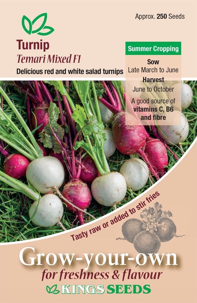 Kings Seeds – Vegetable – Turnip Temari Mixed F1 :- An mixture of red and white salad turnips. Pure white roots accompanied by tasty red roots with white blushed inner flesh. Delicious eaten raw in salads when young or cooked when fully mature.