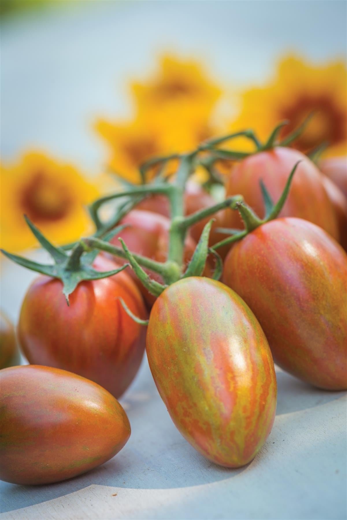 This wonderful Tomato can yield of 300-350 fruits in a season. Larger than a cherry but smaller than a roma, with green stripes, touches of shimmering gold, unique almond shape and sweet, succulent flavour. Colour your salads with greens and golds, or enjoy snack-sized fruit fresh form the vine.