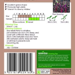 It has an excellent globe shape with a refined tap root and has very healthy erect foliage with partial resistance to downy mildew.