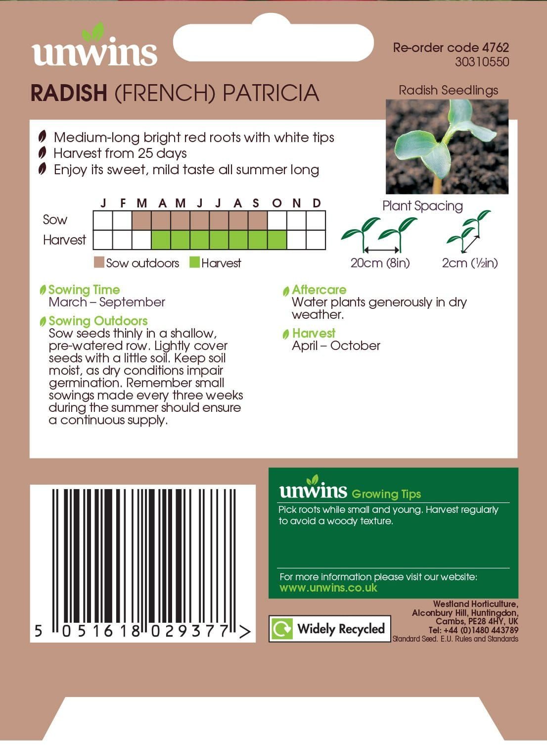 Lovely French Breakfast variety which is very fast maturing. Possesses a mild yet sweet flavour for harvests from spring right through to autumn.